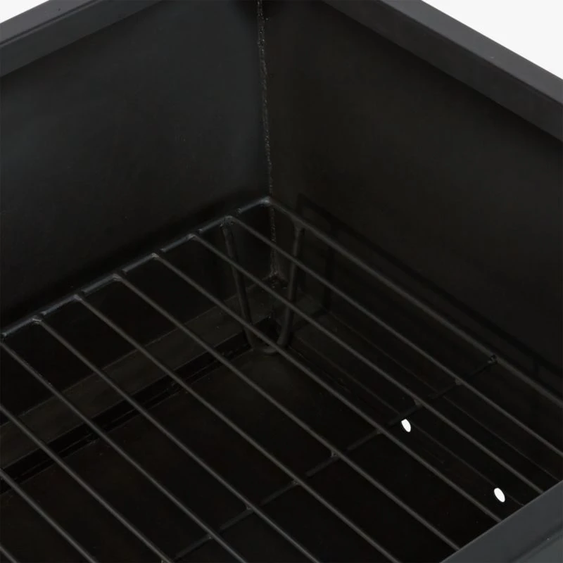 Black iron fire pit lays out four feet of woodburning space to heat up chilly nights. Simple rectangular profile looks sleek with a fire or without. CB2 exclusive.