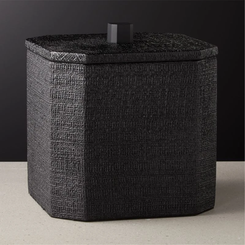 Fresh take on texture meets coveted vintage find in this square wooden ice bucket, wrapped in matte black lacquered linen. Lid with deep brushed black knob lifts to reveal removable stainless steel liner. CB2 exclusive.
