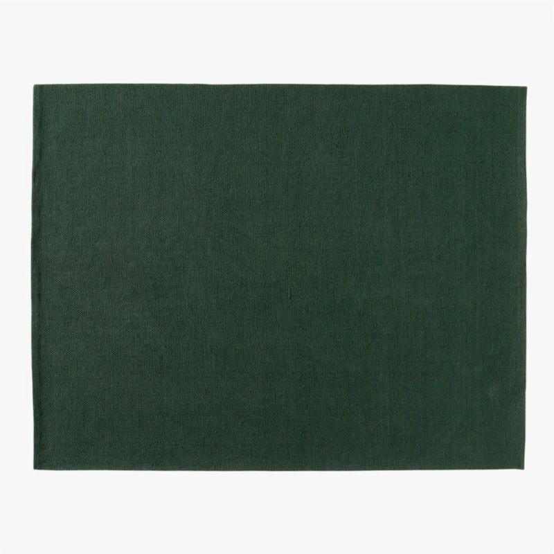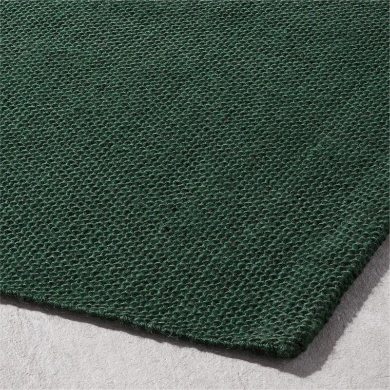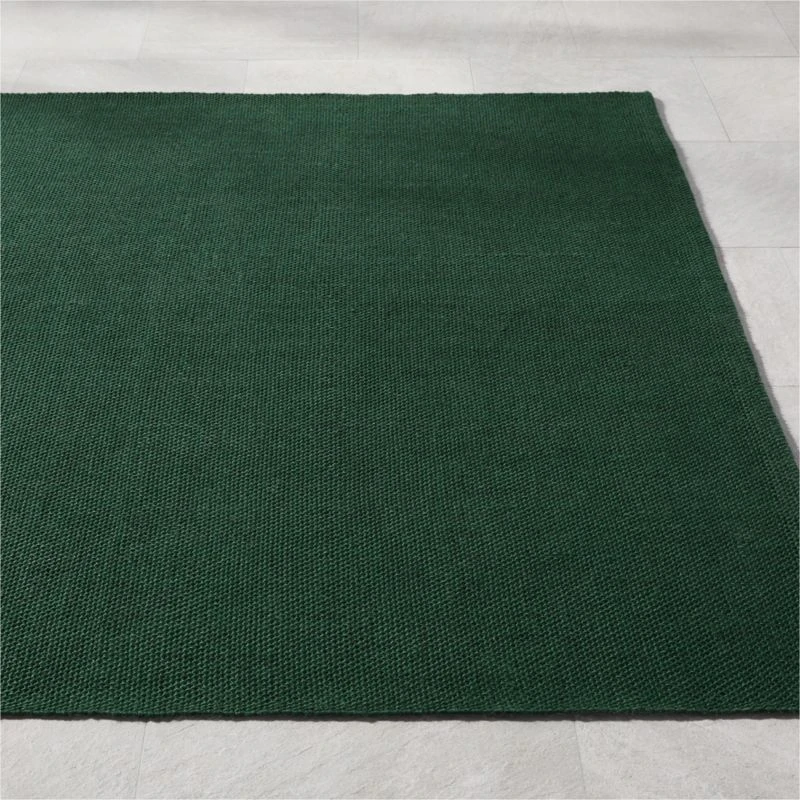 Flatweave area rug in tonal green offers rich texture and depth indoors or out. Designed to weather the elements, the performance rug is woven of recycled yarn certified to the Global Recycled Standard (GRS) to resist fading and wear season after season. CB2 exclusive.