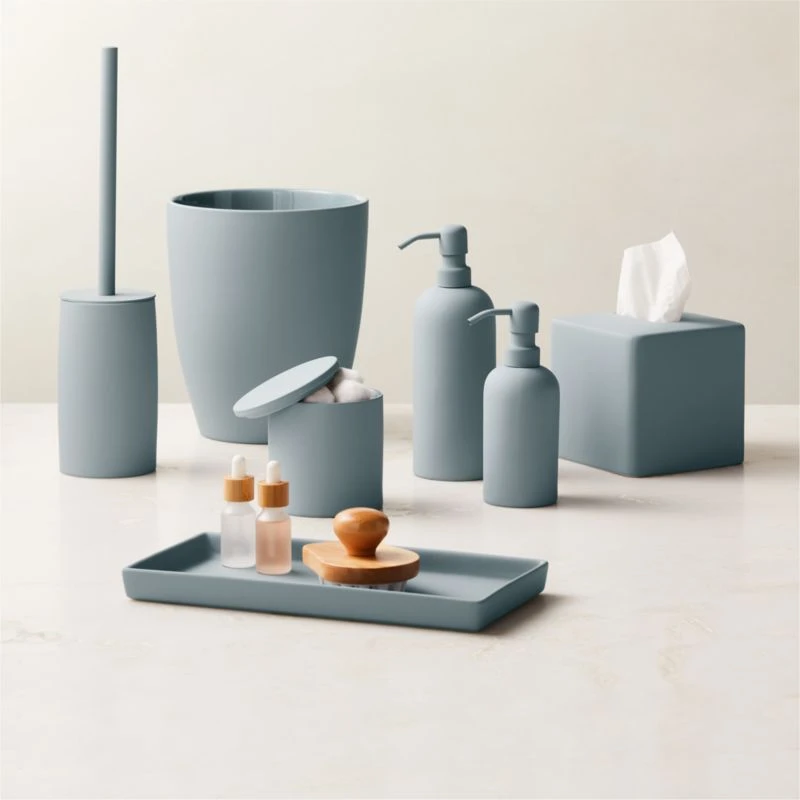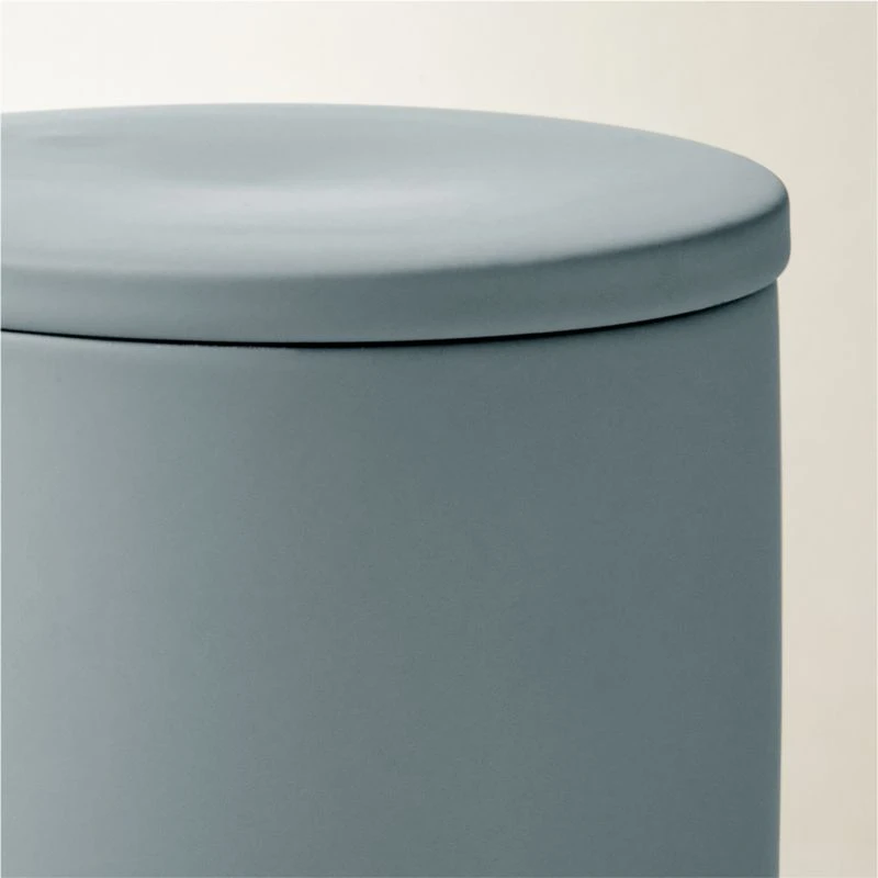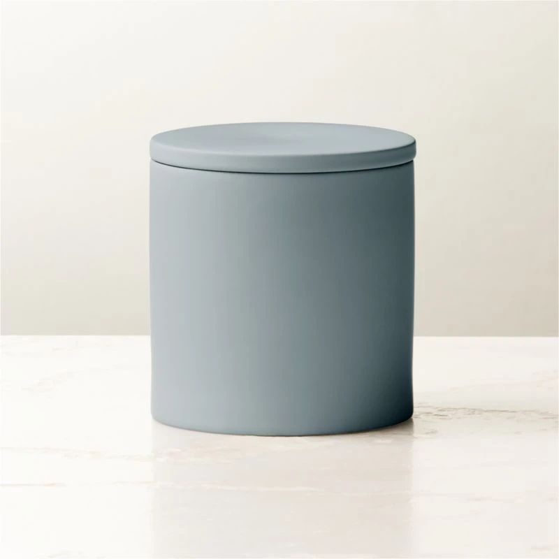 Matte blue stoneware canister offers display-worthy storage with a surprising and easy-to-clean rubberized finish. Pair with the full rubber-coated bath accessories collection for a coordinated look. CB2 exclusive.