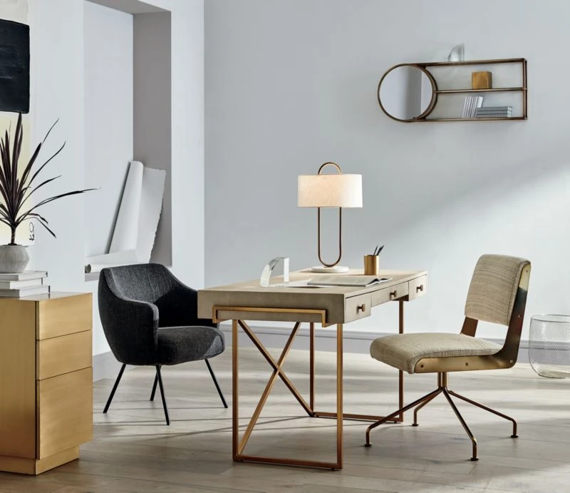 Inject some fashion sense into your 9-5. Designed by Mermelada Estudio, seat pays tribute to the glam life of Paris in the ’50s. Stylish nubby-blended fabric complements sleek brass-plated frame without stealing the show. No need for casters when you look this chic. Learn about Mermelada Estudio on our blog.