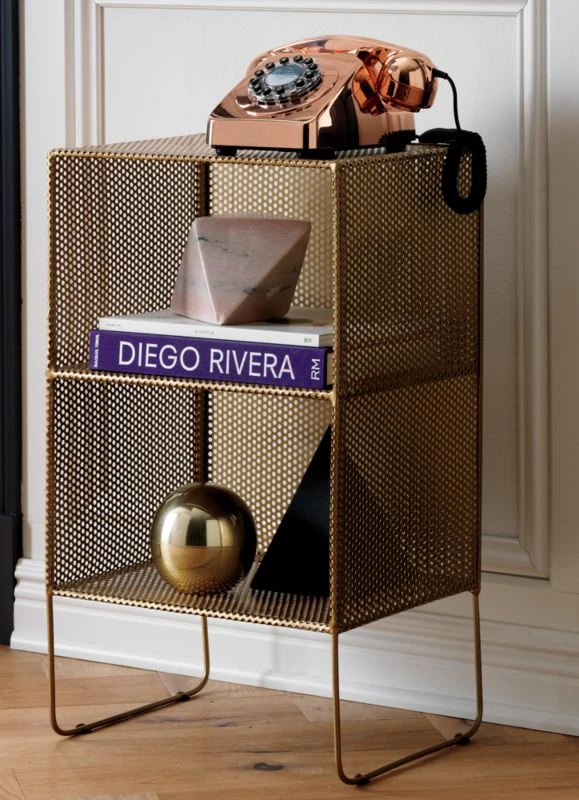 Industrial mesh cubbies rise single file, two tiers tall, on handcrafted metallic iron frame with exposed brass welding. Shelves shoes, books and wine in the bedroom, office, kitchen or entryway. We like to grid the wall with multiples to maximize small spaces.