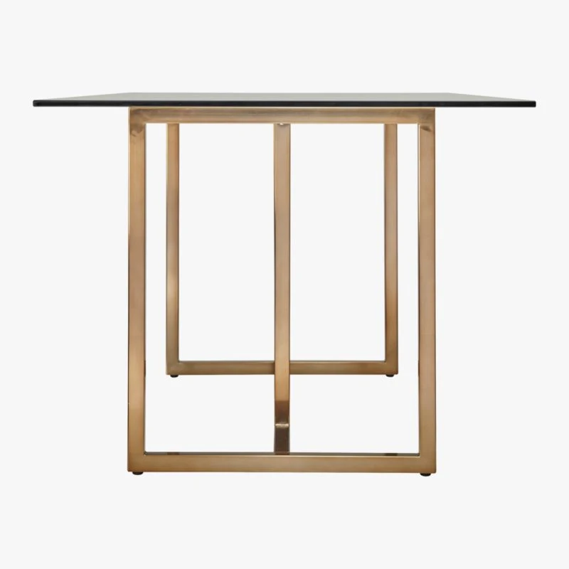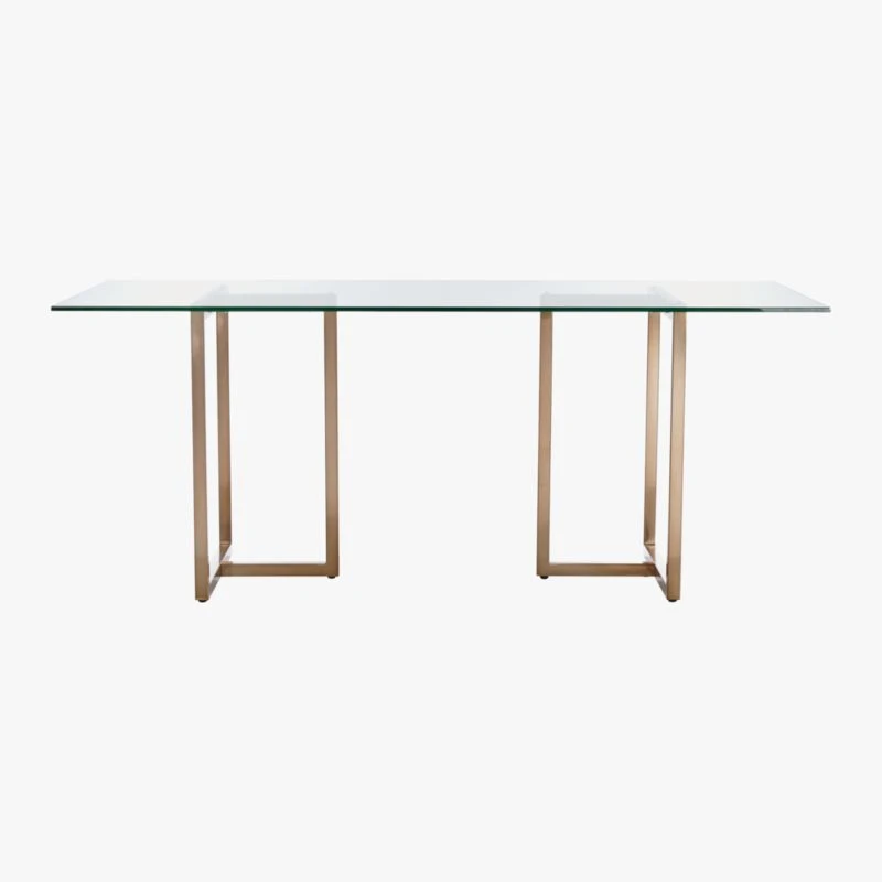 A gilded update to our popular chrome version. Two sleek brass “sawhorses” partner with crisp, clear glass tops, rectangle or round—your choice. For more leg room and stability, turn the brass-plated iron structures T-in at the ends (shown).