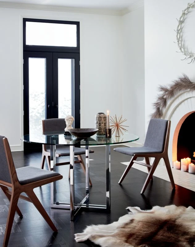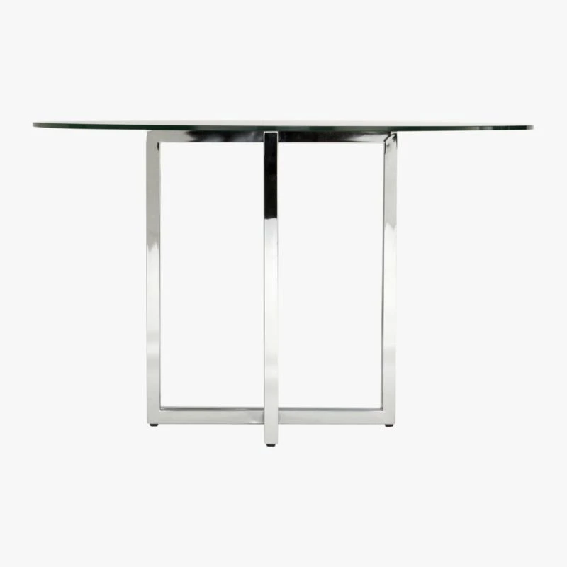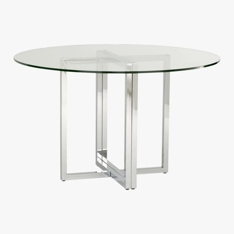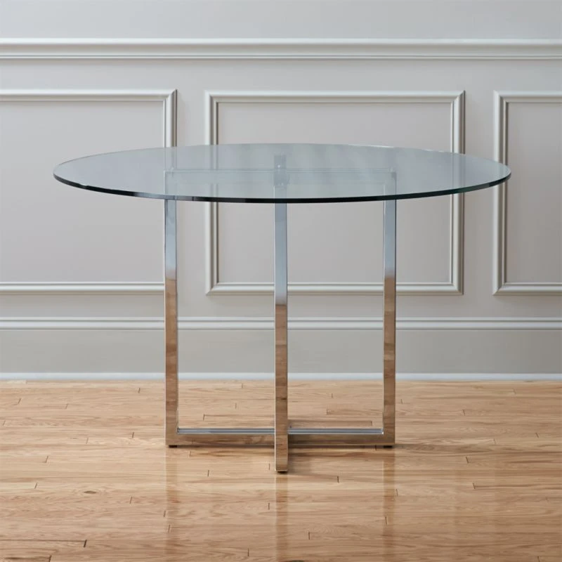 No lone rangers here. Two sleek chrome modern “sawhorses” partner with crisp, clean clear glass tops, round or rectangle—your choice. For more leg room and stability, we suggest the chrome-plated iron structures meet in the middle (shown).
