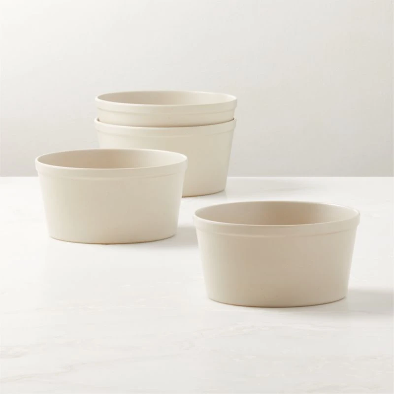 Ideal for alfresco entertaining, oat-colored melamine bowls by Lawson-Fenning mimic the look of ceramic, but are made of chip-resistant melamine and bamboo. Straight-sided bowls have a rim for easy stacking; complete dinnerware set pairs well with matching Sojourn picnic basket. Set of four. CB2 exclusive.
