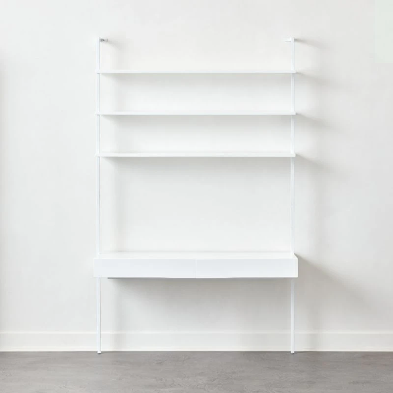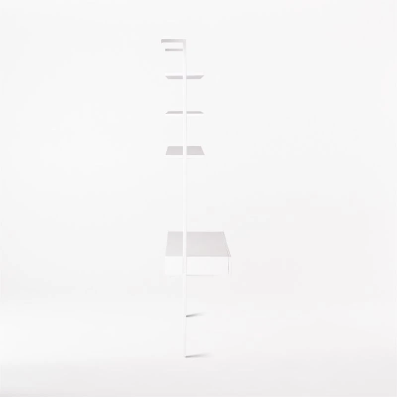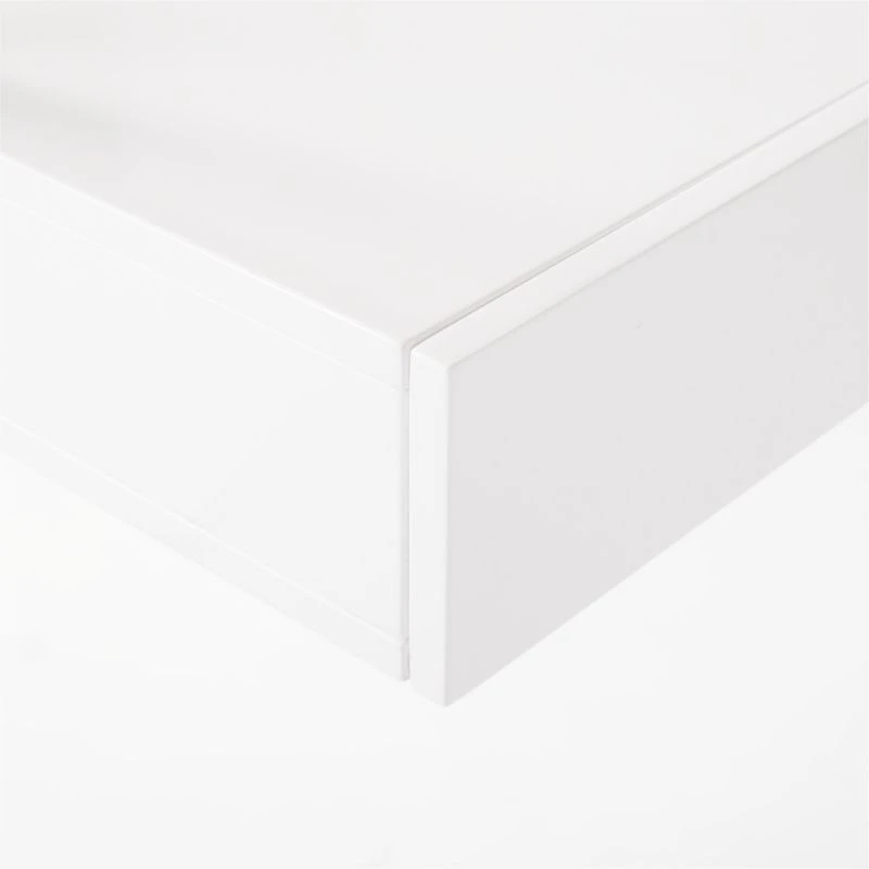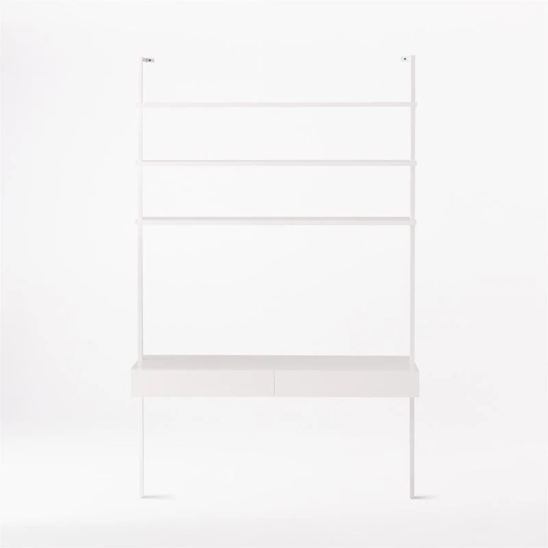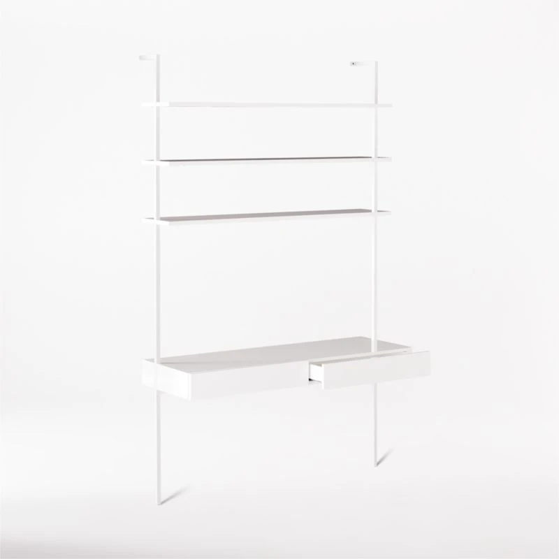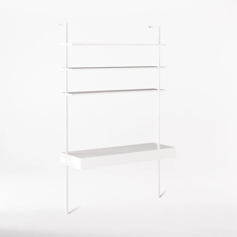 Our best seller goes wide for a sleek, minimalist office space. Three shelves ladder up in glossy white engineered wood while a powdercoated aluminum frame hides hardware expertly. Mounts sturdy to the wall with two push-to-open drawers for extra storage. CB2 exclusive.