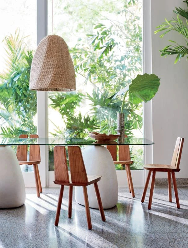 Vintage-inspired piece mixes glass, brass and stone in an everyday dining table that’s anything but ordinary. Designed by Caleb Zipperer, table is set on two organic-shaped stone/cement bases with natural ivory tones. Brass-plated arms extend out in large Xs to support a thick clear glass top. Table seats six easily. Learn more about Caleb Zipperer on our blog. CB2 exclusive.