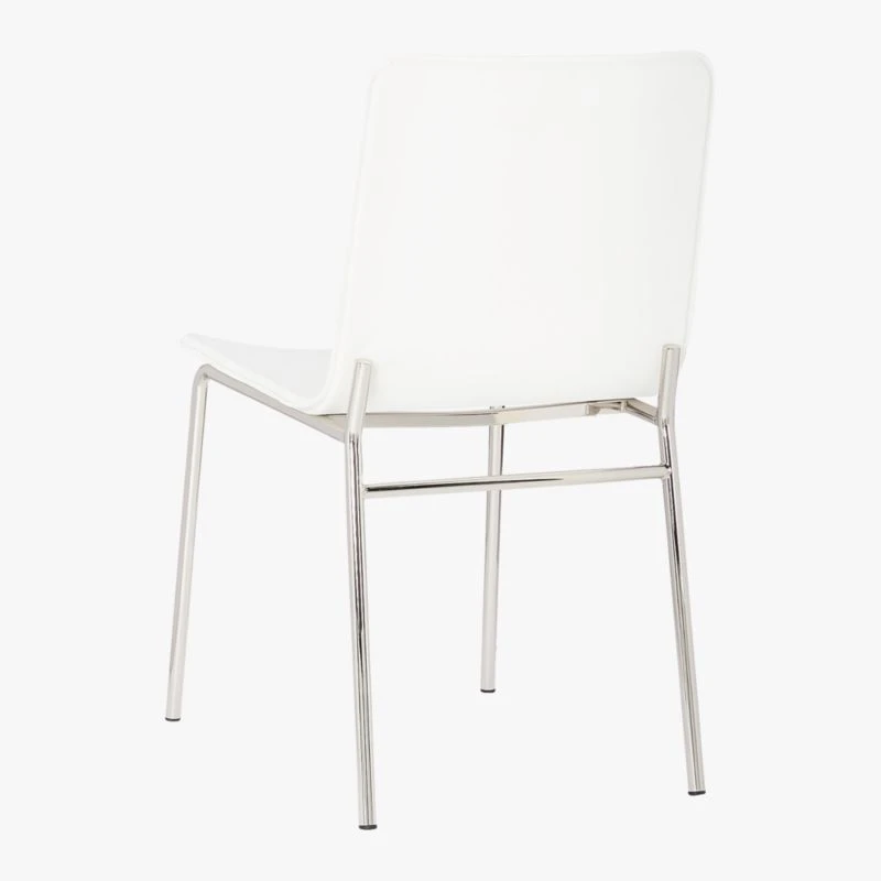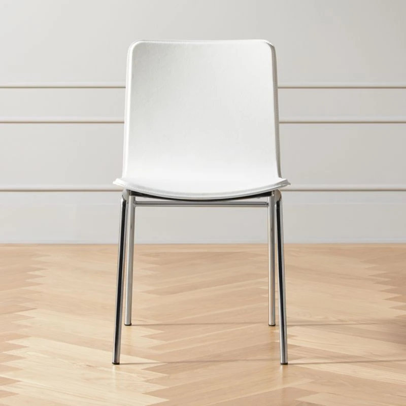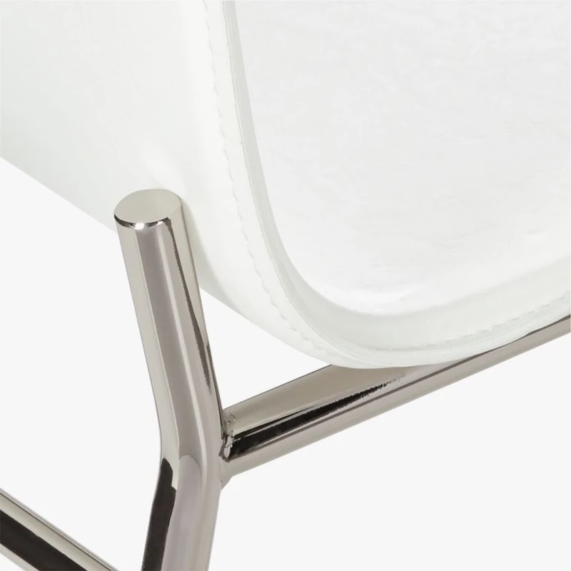 Defined by its luxe details and unexpected curves, modern chair sits pretty from all angles. Designed by Jannis Ellenberger with satin-finished nickel frame and cushioned white bonded leather seat, chair brings high-end design to the table for a minimal price. Learn about Jannis Ellenberger on our blog. CB2 exclusive.