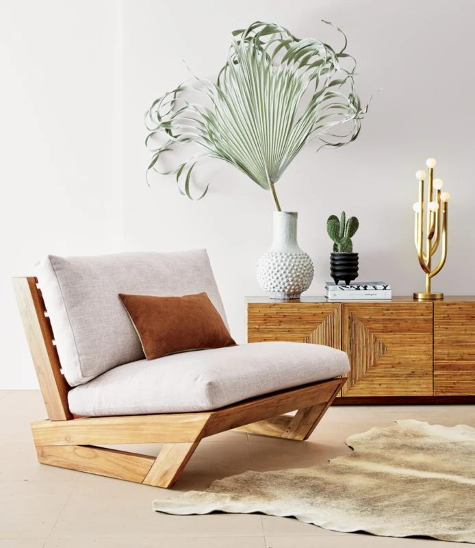 Exaggerated scale and dramatic angles create midcentury appeal with a distinctively modern twist from the fresh design minds at Fred Segal. Weather-resistant fabric tailors the seat and back cushions in a relaxed linen-like neutral. When left uncovered, the chair will patina to a beautiful silvery grey. CB2 exclusive.