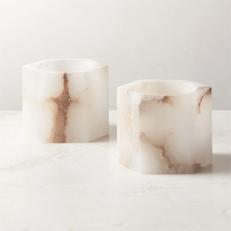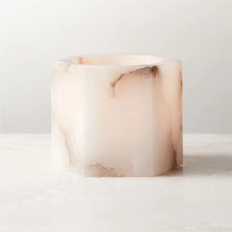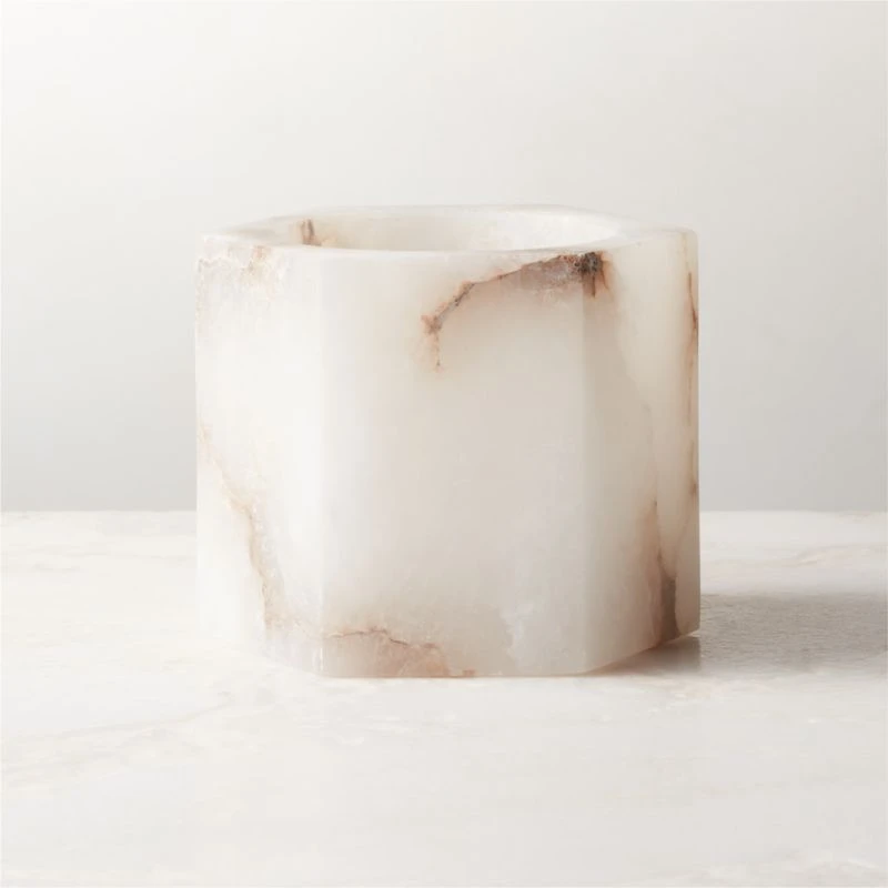 Carved out of solid alabaster, hexagonal candle holder beautifully illuminates the glow of a single tealight candle. Striking on its own and practically magical when a candle is lit within. Because alabaster is a natural stone, each candle holder will spotlight varying levels of activity. CB2 exclusive.