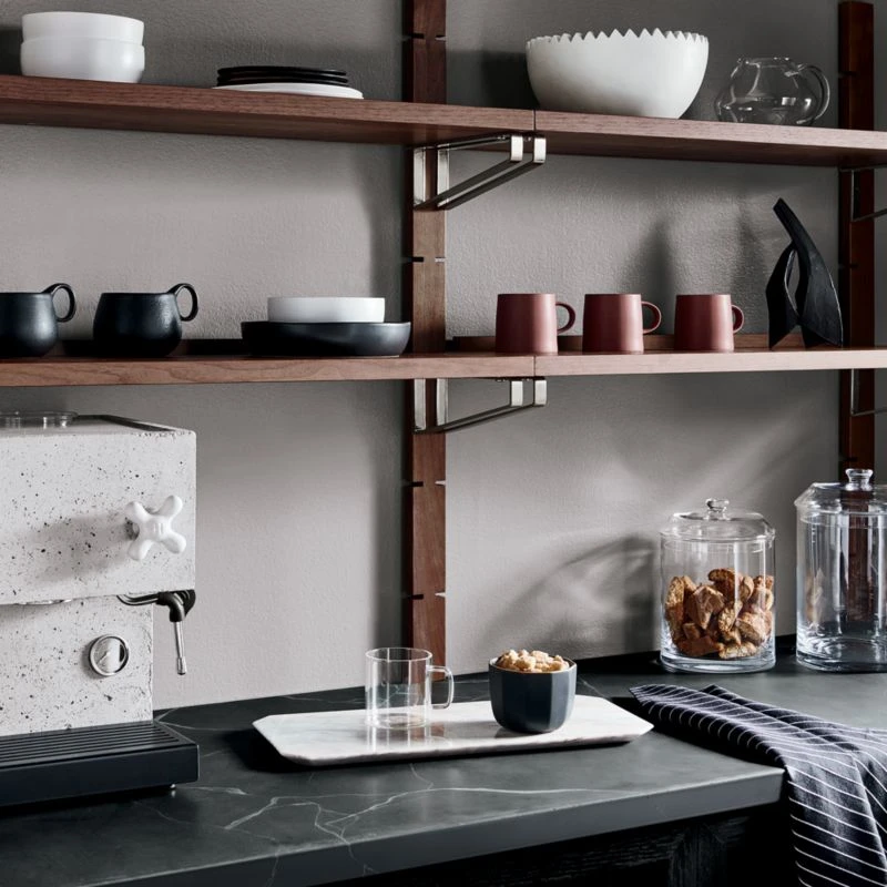 Designed by Leonhard Pfeifer, warm walnut shelves float the wall in modular design. Champagne metal shelf brackets can be slotted at varying heights for the ultimate in flexibility and customization. Need more storage? Just add more single shelves or upright pieces (sold separately). Learn about Leonhard Pfeifer on our blog. CB2 exclusive.